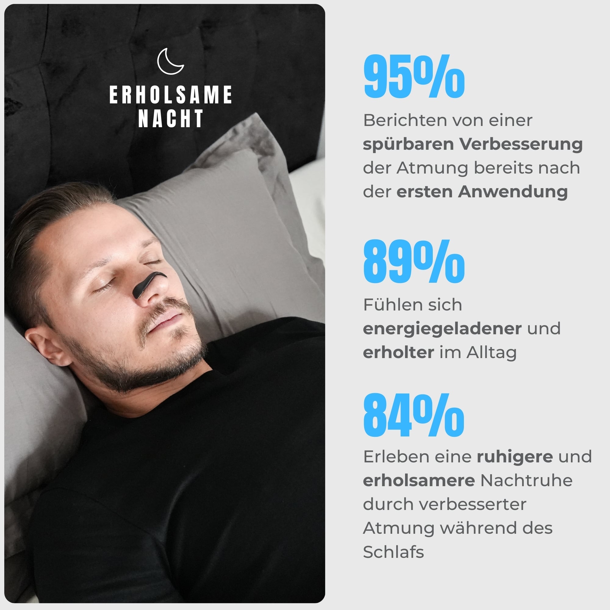 Endlich durchschlafen – ohne Schnarchen, ohne verstopfte Nase. Mit freier Nasenatmung erlebst du tiefere Regeneration, mehr Energie am Morgen und einen erholsamen Schlaf wie schon lange nicht mehr. Spürbar ab der ersten Nacht.
