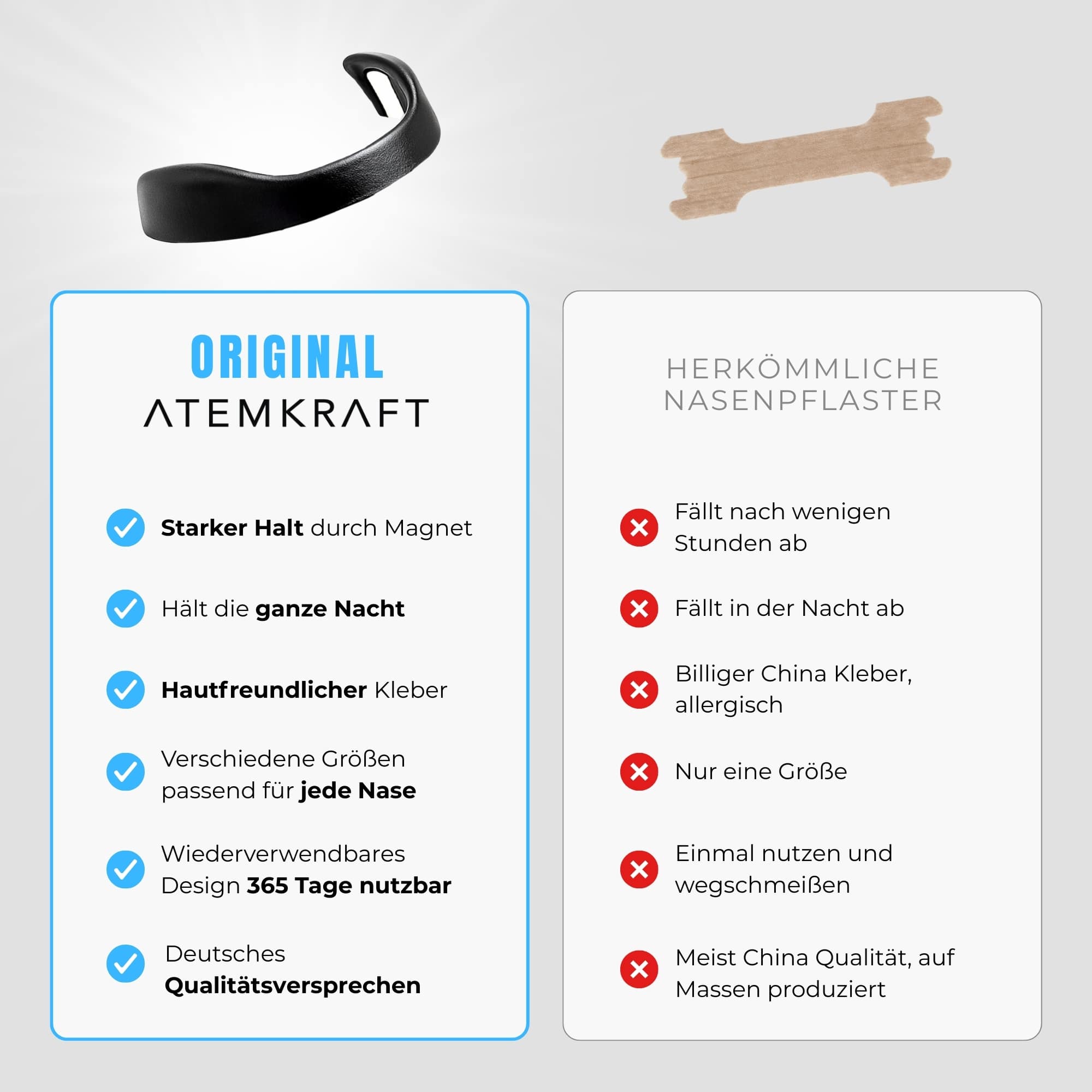 Ja, absolut. AtemKraft ist für die Nachtanwendung optimiert. Der Magnetbügel sitzt stabil, stört nicht und hilft vielen Nutzern dabei, durch die Nase zu atmen und besser zu regenerieren.